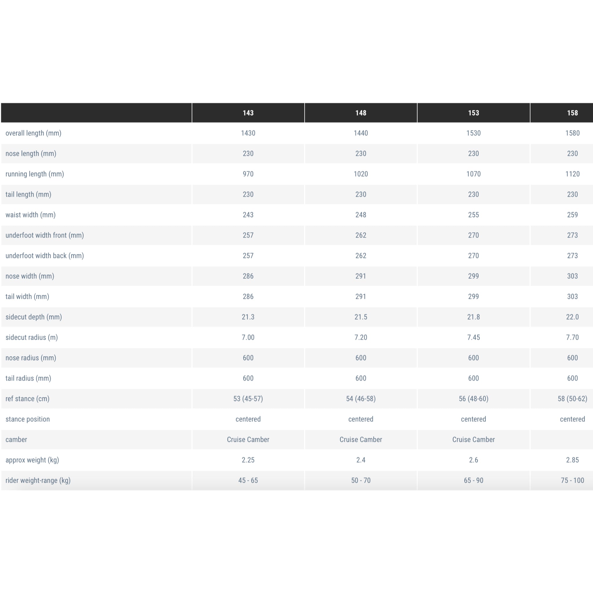 A half-fat camber for all-mountain dominance. Its toned-down dimensions deliver a precise and lively feel much like Pop Camber, but with much improved deep snow performance and a more “broken-in” feel out of the shrink-wrap. In Amplid’s directional snowboards a touch of early rise is added to Cruise Camber to improve buoyancy even further.