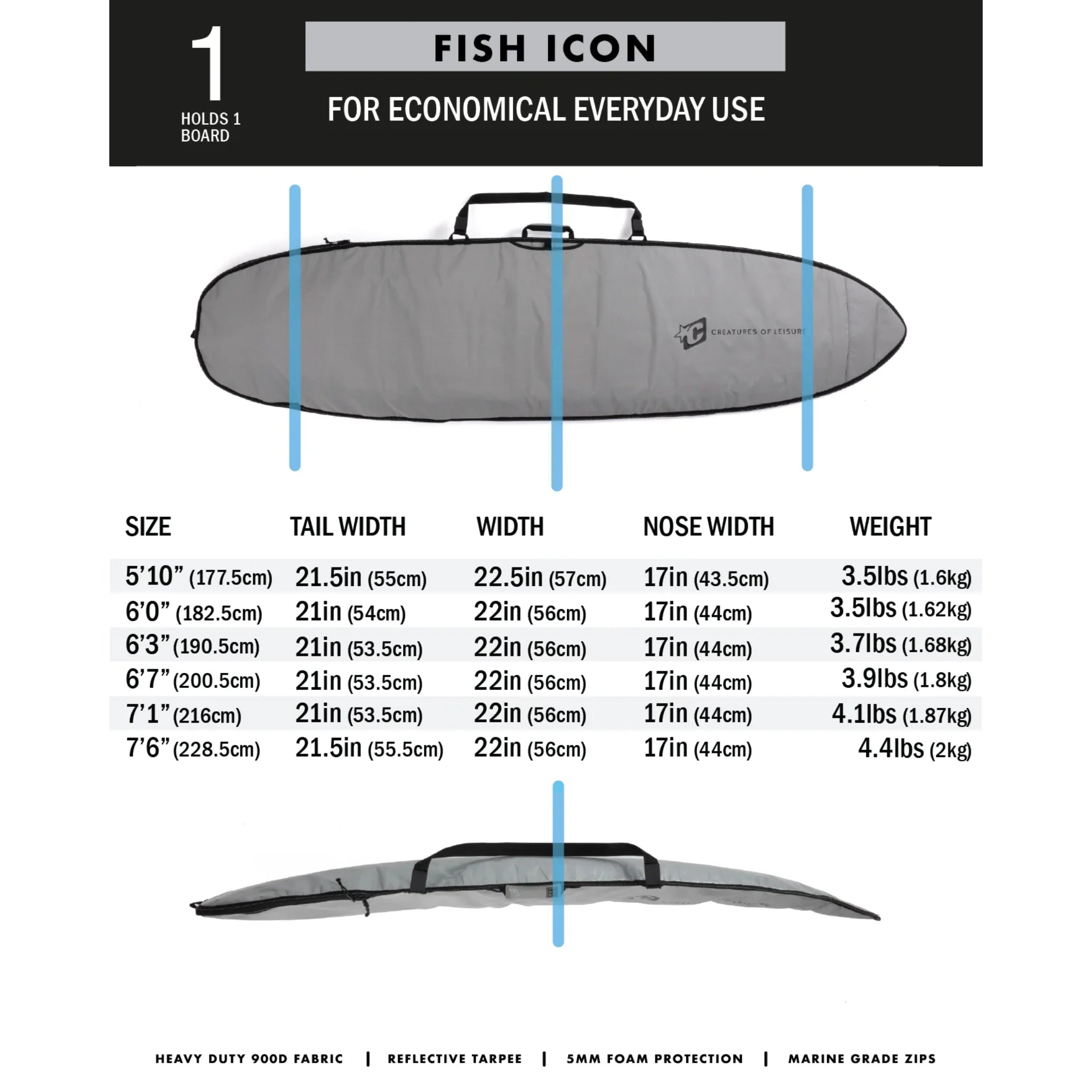 The Fish ICON Boardcover is designed for wider fun boards. The single board capacity covers are perfect for in-home storage or in-car transport to and from the beach.