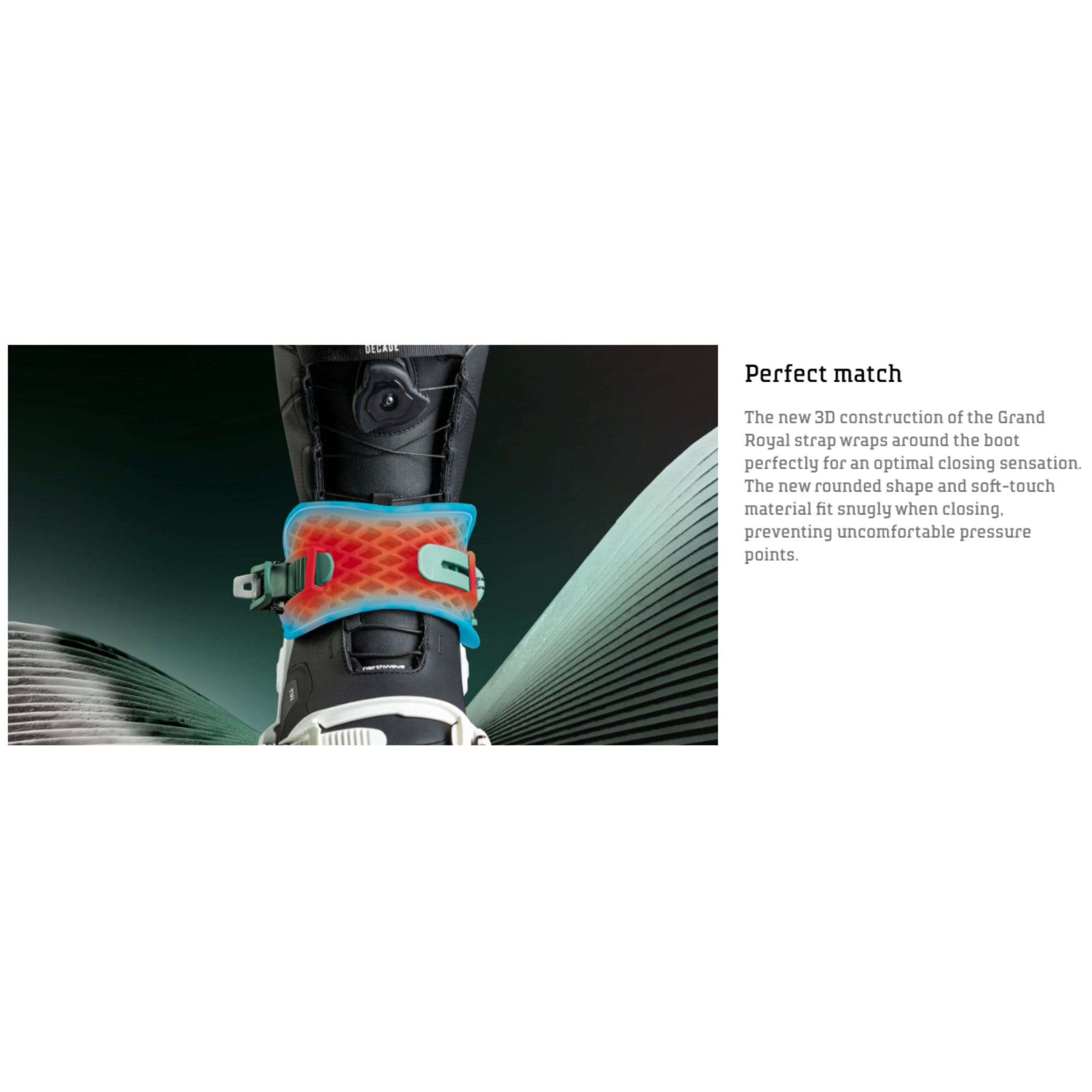 The new Grand Royal anckle strap allows maximum power transmission thanks to its volume, maximum adaptability thanks to its geometric pattern and total comfort due to its 3D shape which eliminates all painful contact points.