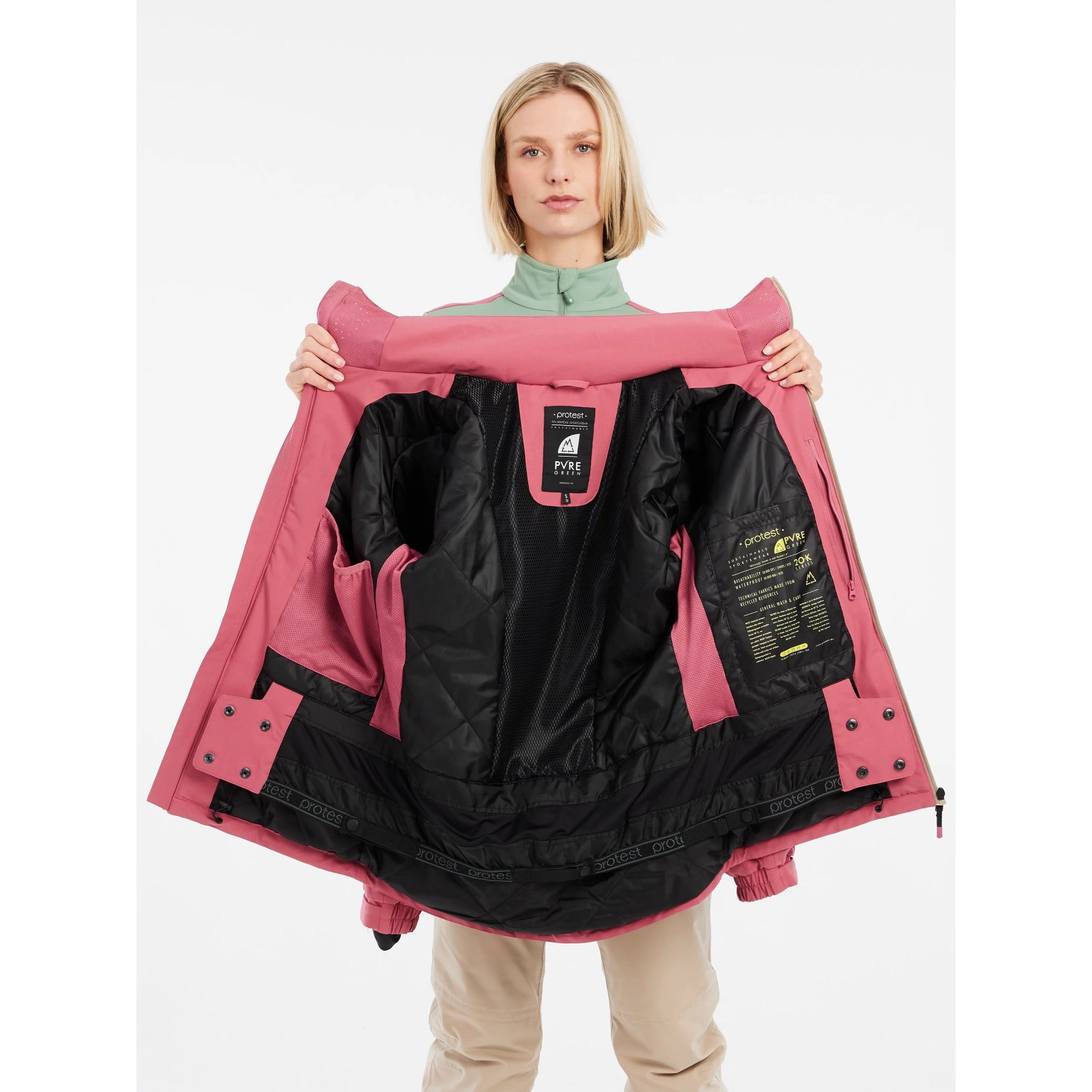 The PRTBEVERLY ski and snowboard jacket by Protest is a combination of ingenious fashion technology with a dose of Protest style. Part of our PVRE Green series, the PRTBEVERLY is also made with the environment in mind. Made of recycled materials, the PRTBEVERLY features full taping, a 20K water-repellent finish and waterproof zippers, inside placket and fixed hood: ideal for locking out the snow and slush. The PRTBEVERLY’s high 20g breathability, stretch waist gaiter and ventilation zips under the armpits mean you’ll always be nice and dry. The PRTBEVELERY ski and snowboard jacket has ergonomic shaping, a slim fit, and a regular length. The PRTBEVERLY’s inner cuffs with thumb hole and half-elasticated outer cuffs with hook-and-loop fastener are practical during busy skiing days. The single-colour design with contrasting zip completes the chic look. Did we mention the very handy goggle pocket and lift pass pocket?