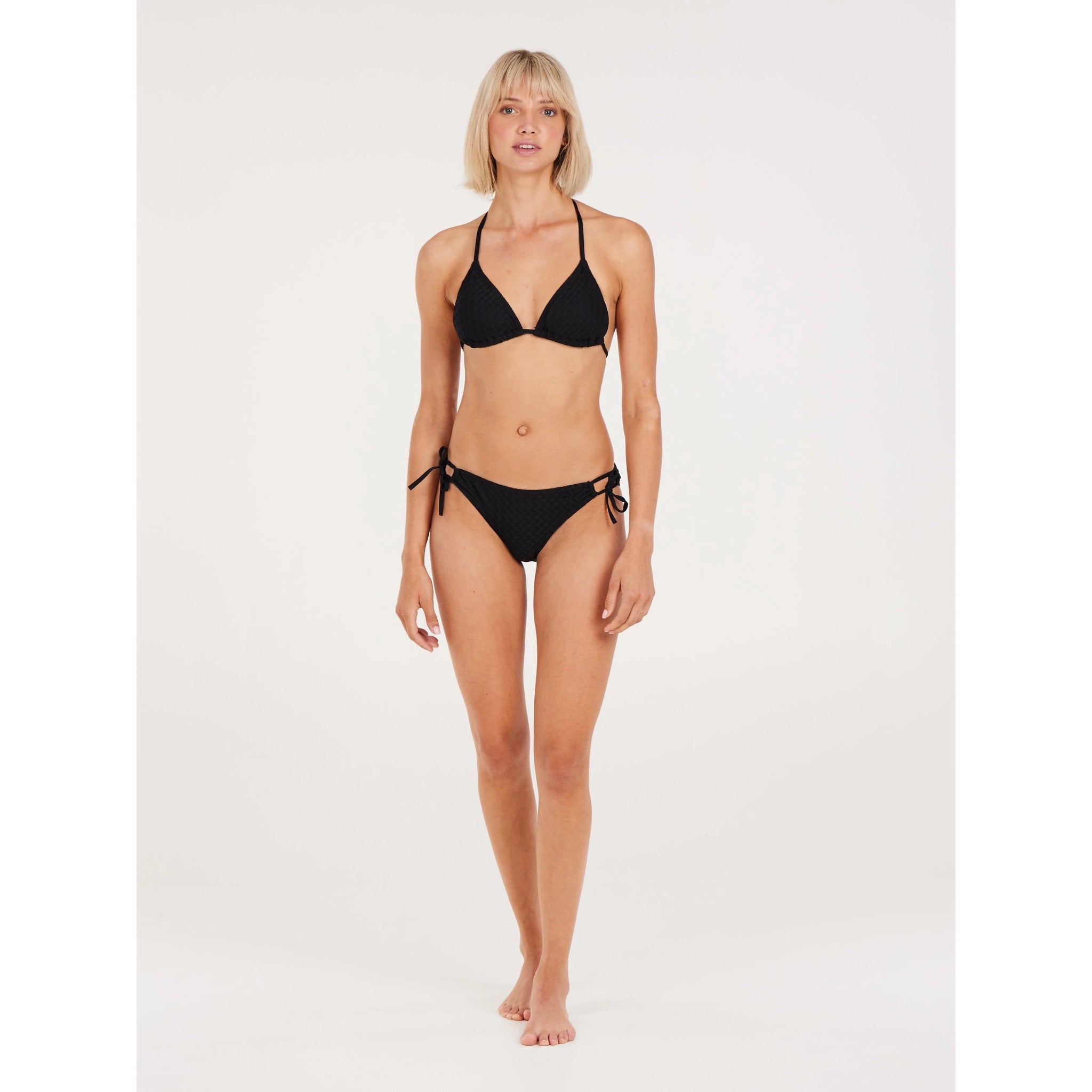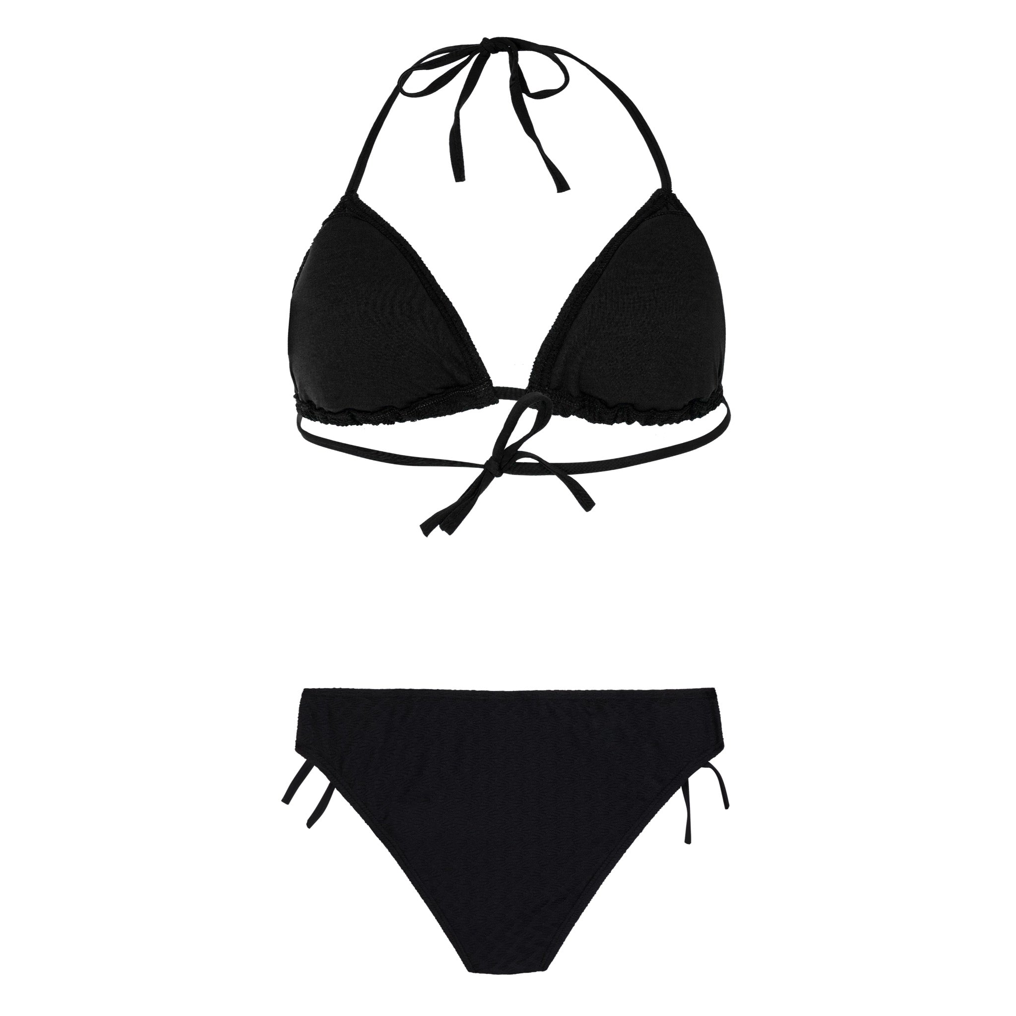 Meet your new summer essential, the PRTELENAS by Protest. This set comes with a lovely triangle bikini top with a supportive, customizable fit thanks to the tie closure at the back and neck. There are removable quick-dry cups for extra comfort and support when needed. The matching regular bikini bottoms have cute ties at the sides. The lovely textured fabric adds a charming touch. The PRTELENAS is also part of our initiative to do things greener; no PFCs are used in the production process .