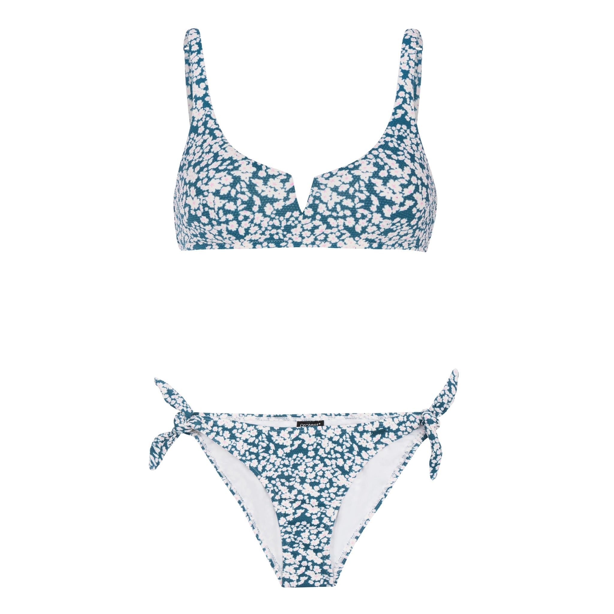 Stand out from the crowd this summer in the PRTLANA by Protest. This set features a delightful floral print. The bikini top closes at the back with a clasp and has adjustable straps. The removable, quick-dry cups add that little extra bit of support when needed. The matching regular bikini bottoms have cute ties in the same fabric at both sides. The PRTLANA is also part of our commitment to making our collections more sustainable; no PFCs are used in the production process.