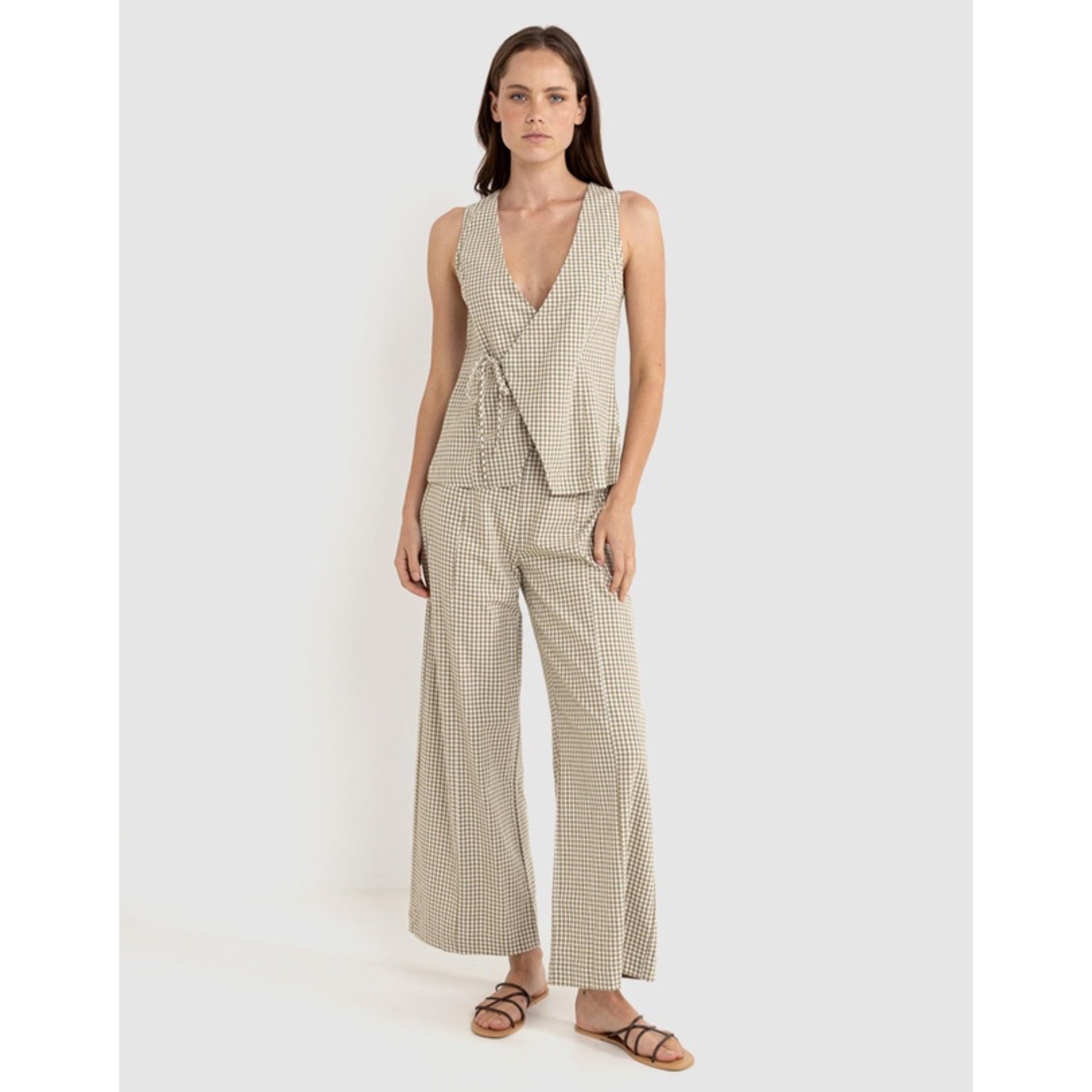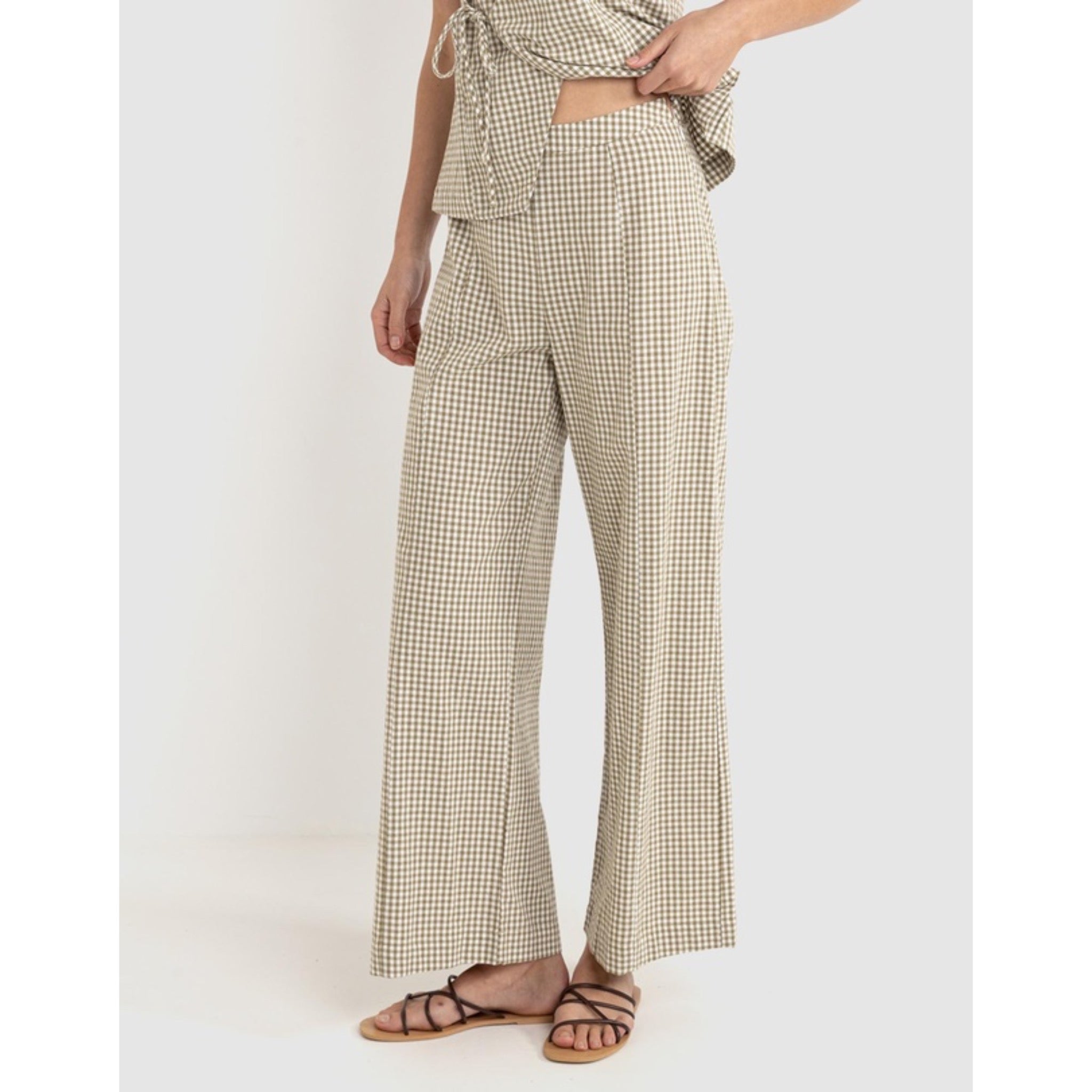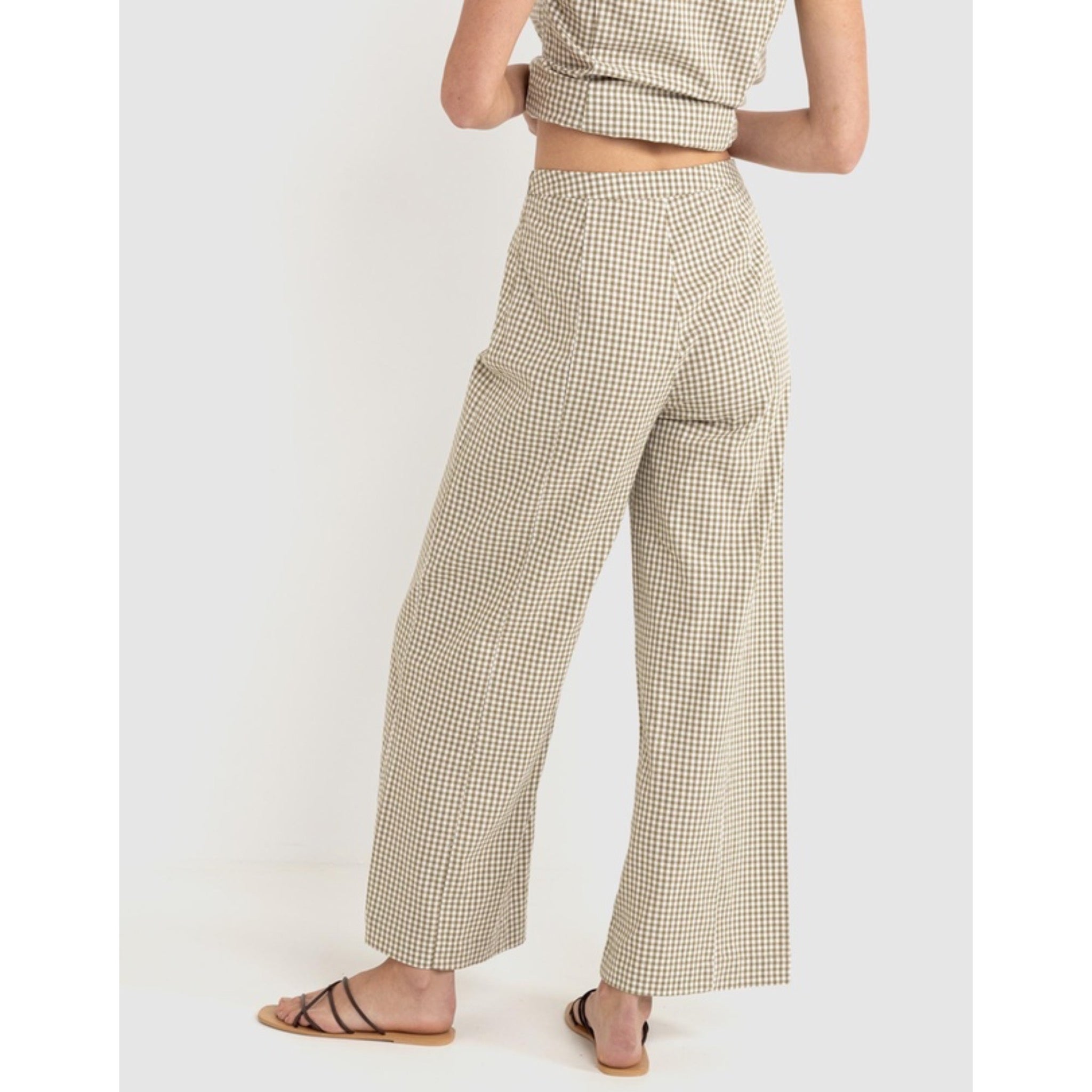Rhythm's Lola Check Wide Leg Pant in Olive delivers an extra-wide leg and a high-waisted fit with a fixed waistband. Feature panel lines through the front and back add structure to this full-length pant.