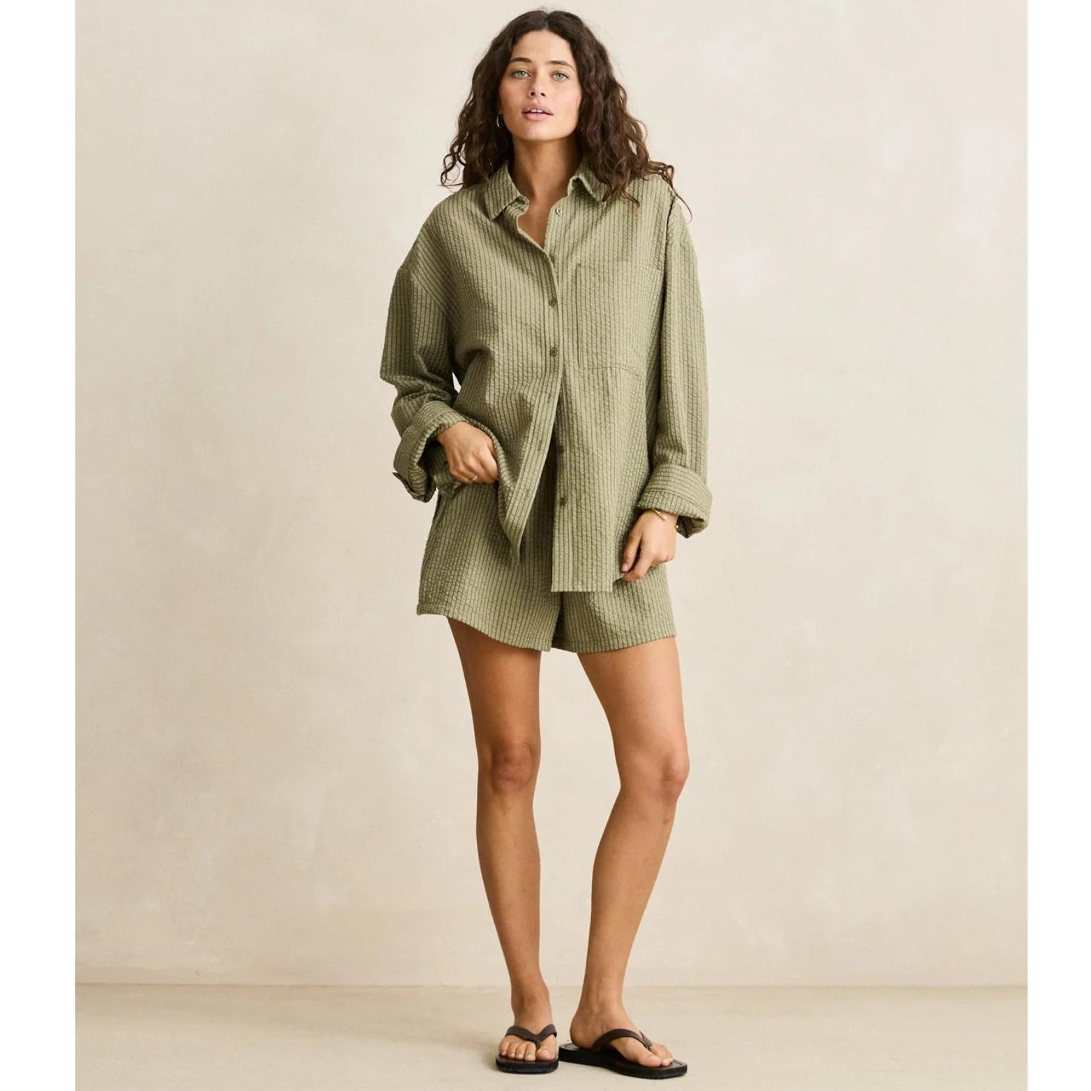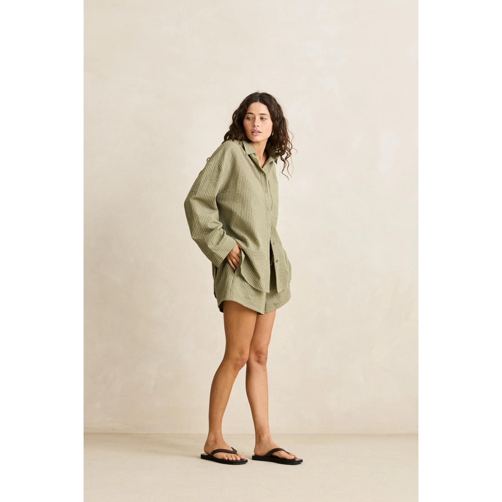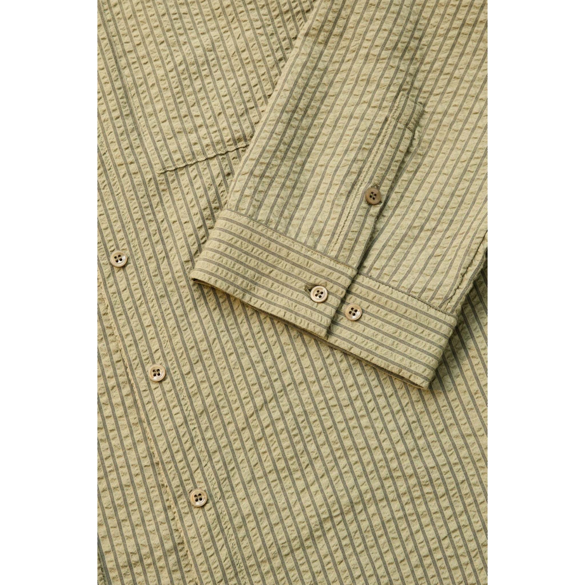 The Overswim Stripe Shirt in Olive is a relaxed, oversized style made from textured stripe fabric. Designed with a tonal button-down front, soft collar, and chest pocket.