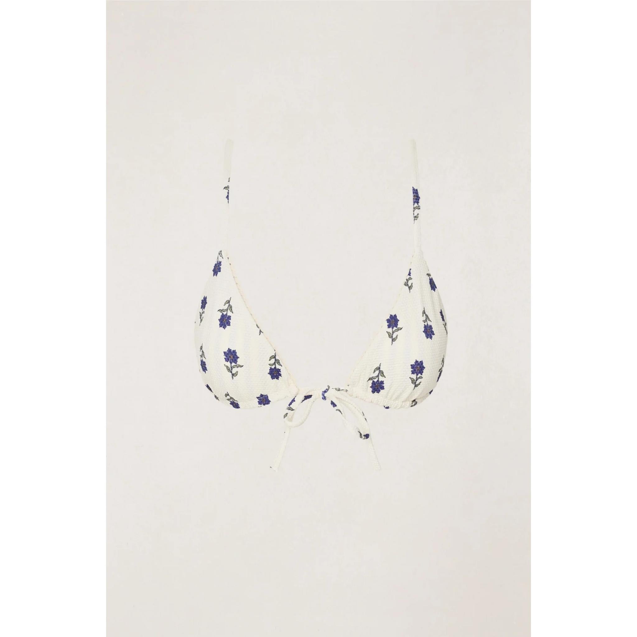 A reversible slide triangle top in a soft bubble-textured fabric. The Primrose Floral Tri switches between floral and stripe prints, finished with simple, adjustable straps.