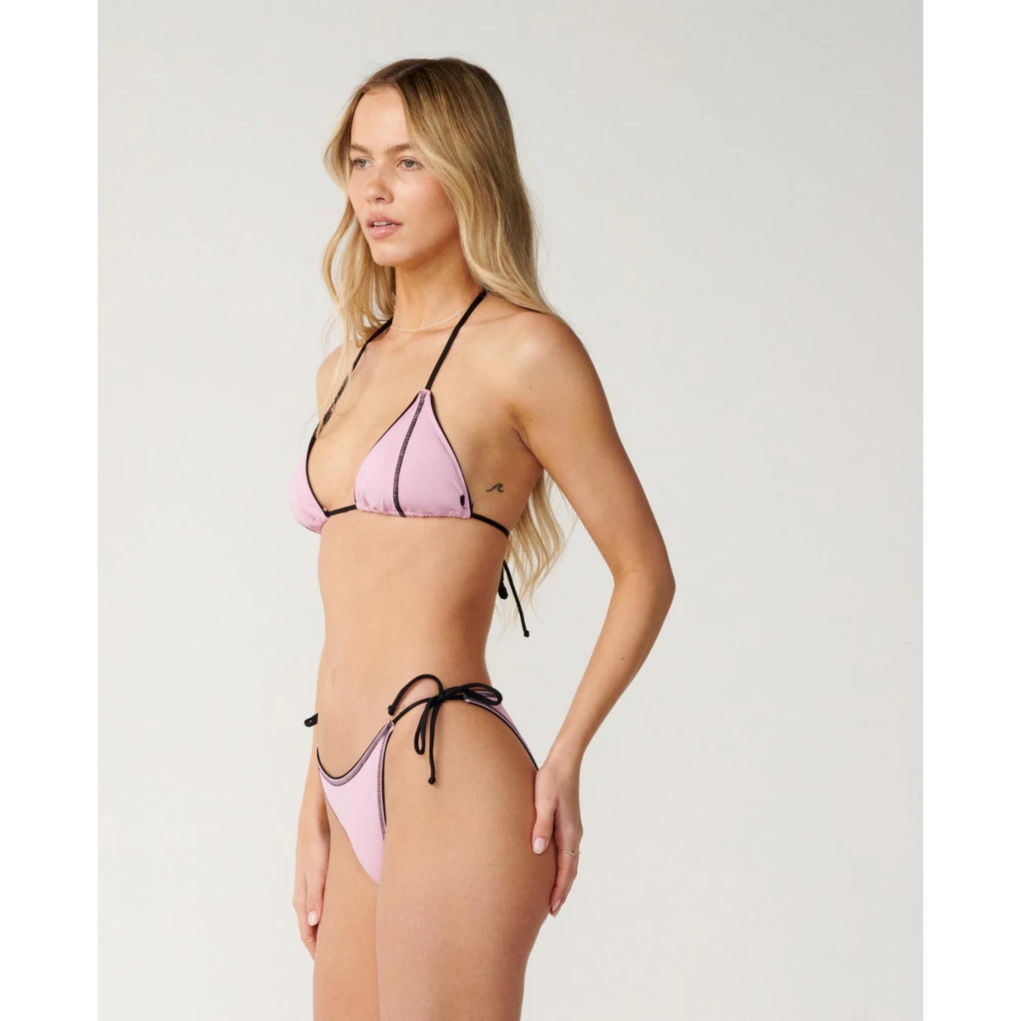 Swimwear for surfing. This Rip Curl x Stephanie Gilmore Sliding Tri bikini top brings two surf icons together, in a style that blends heritage design and modern fabric. Made from recycled microfibre, it has adjustable straps, metal logo trim, and an internal shelf bra with removable padding for light support. Match back with the SG Tie Side Pant.
