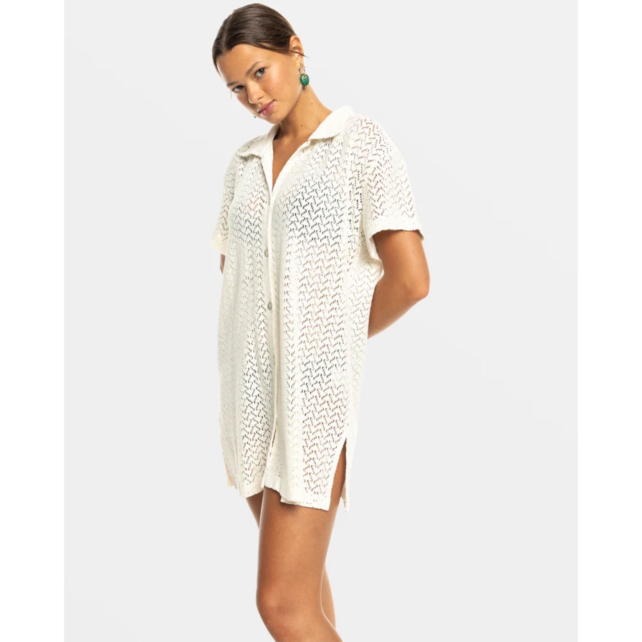 Slip into the Dalia Beach Crochet Shirt Dress and let the warm breeze carry you away. This relaxed, oversized cover-up combines a breezy, bohemian vibe with modern sophistication. Featuring a collar neck, short sleeves, and a front shell button closure, it's the perfect throw-on-and-go piece for beach to brunch and beyond. Featured here in the Egret colourway.