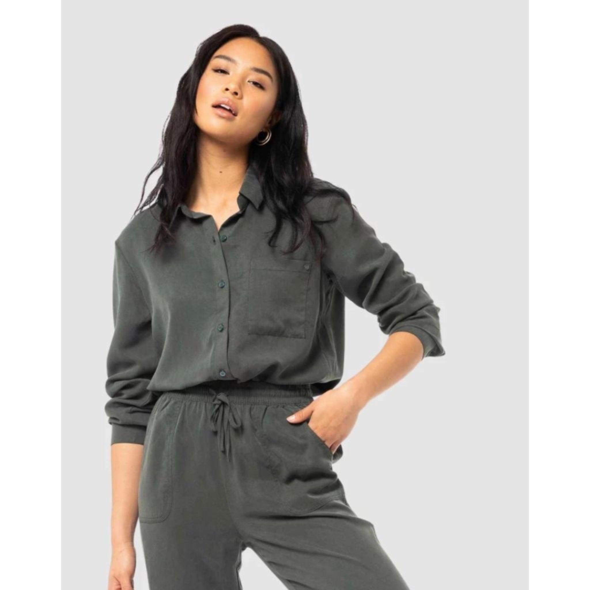 Is the perfect shirt for cooler weather styling. It has a relaxed fit with buttons through front, left chest pocket and is made from light weight tencel.