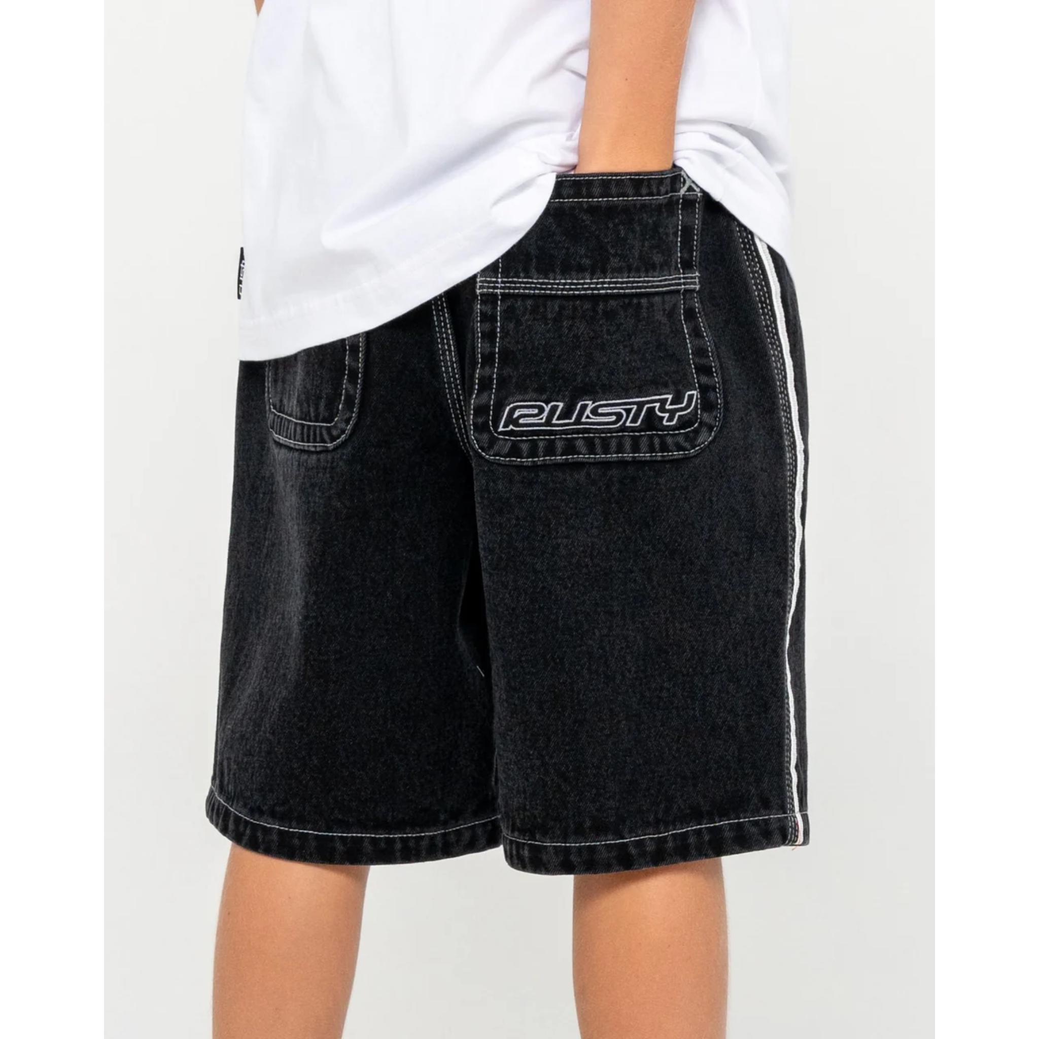 Baggy Fit Jort With Half Elastic Waist & Rusty Embroidery. 12.7oz Rigid Black Denim