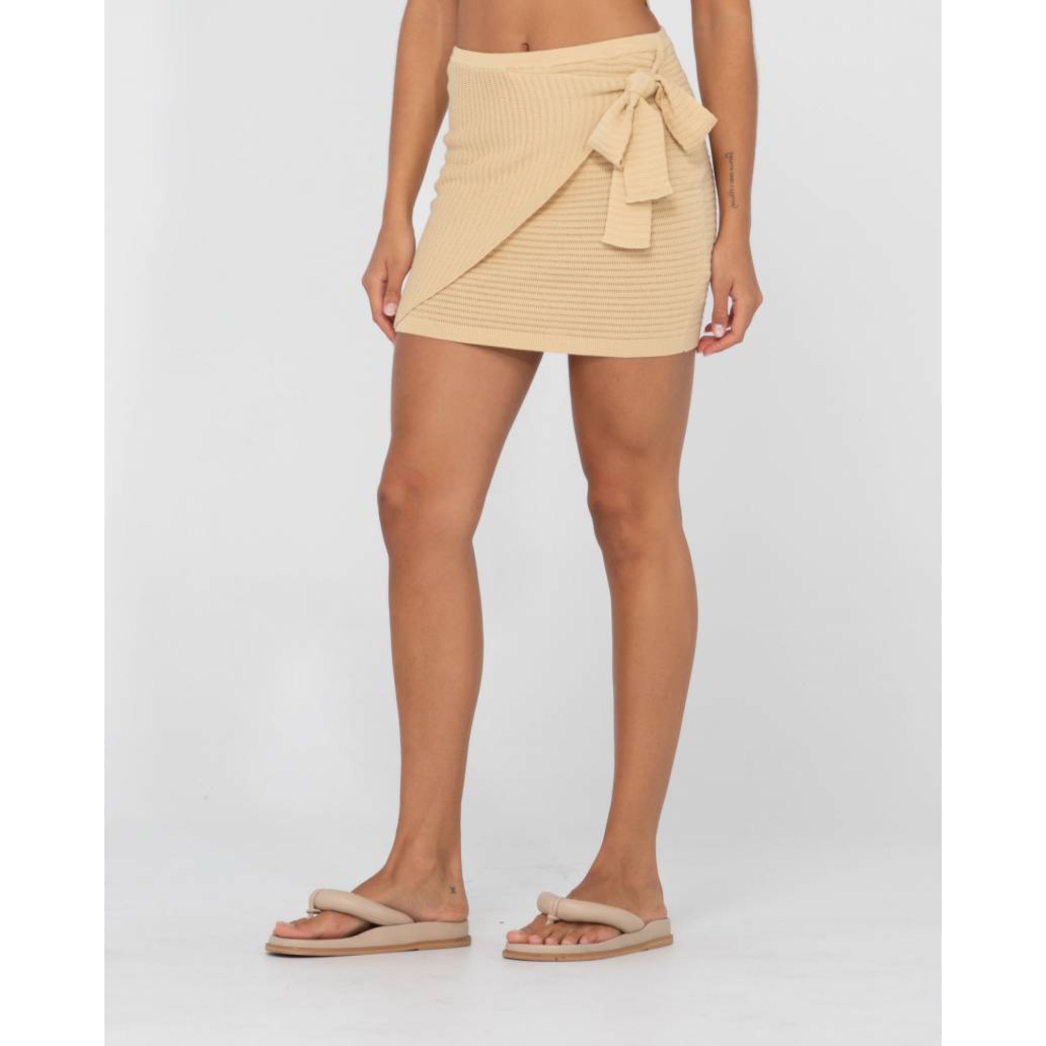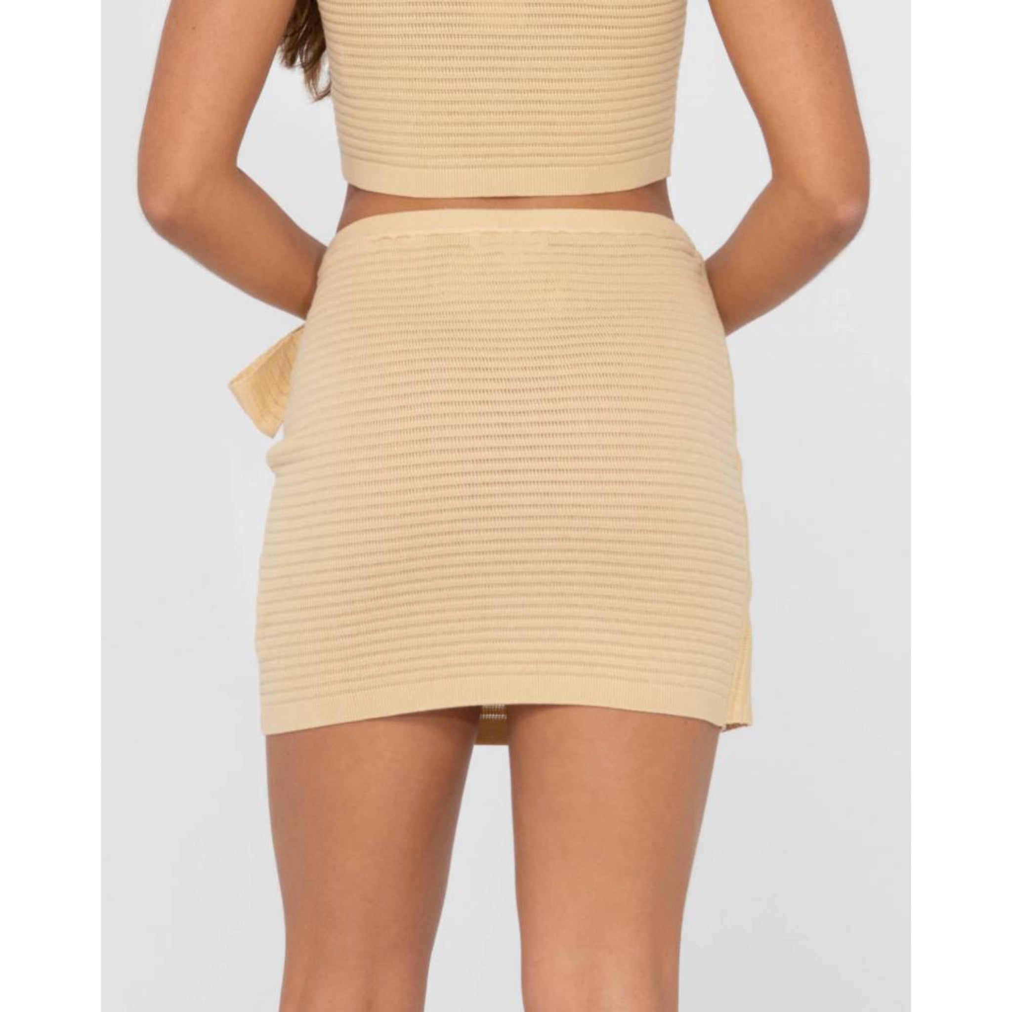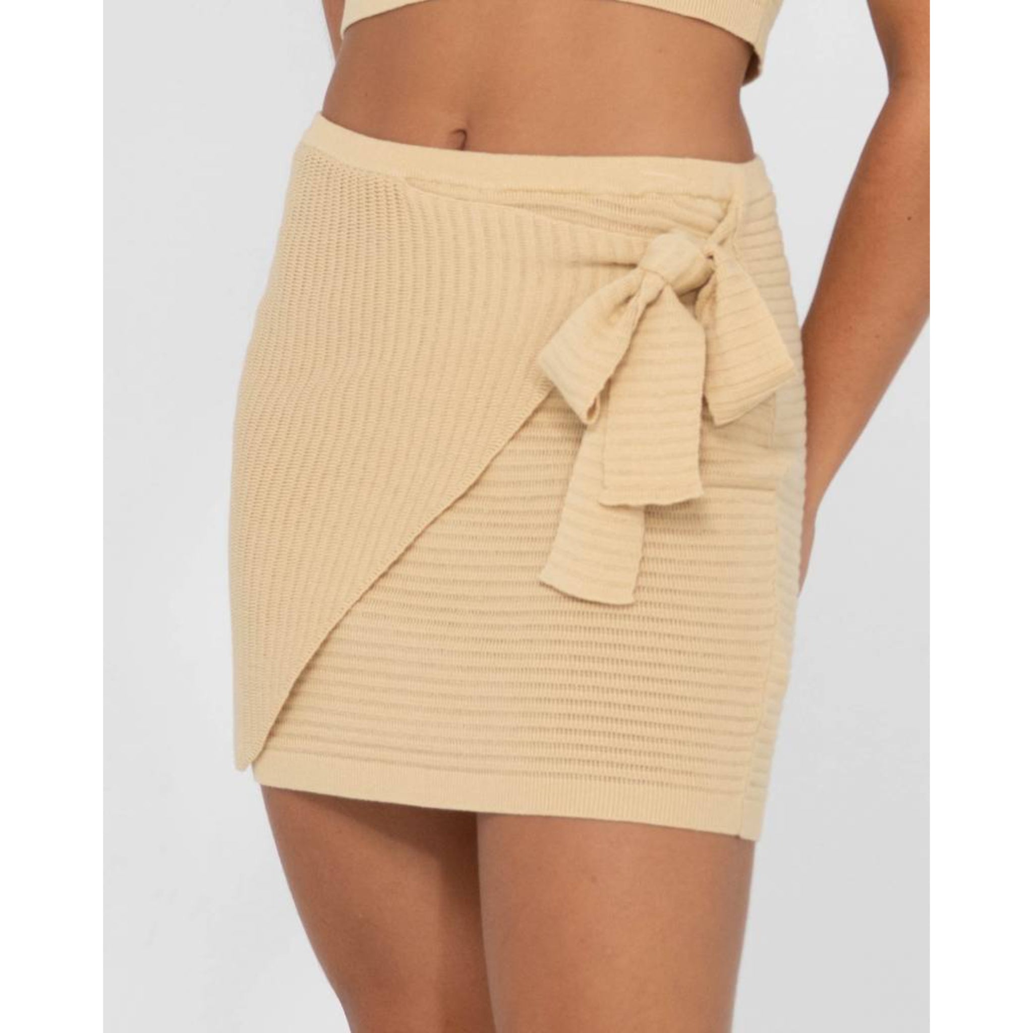 The new Summer Favourite, a slim fit knitted mini skirt with sarong tie detail with, made to look good on those hot summer days, and long balmy nights.