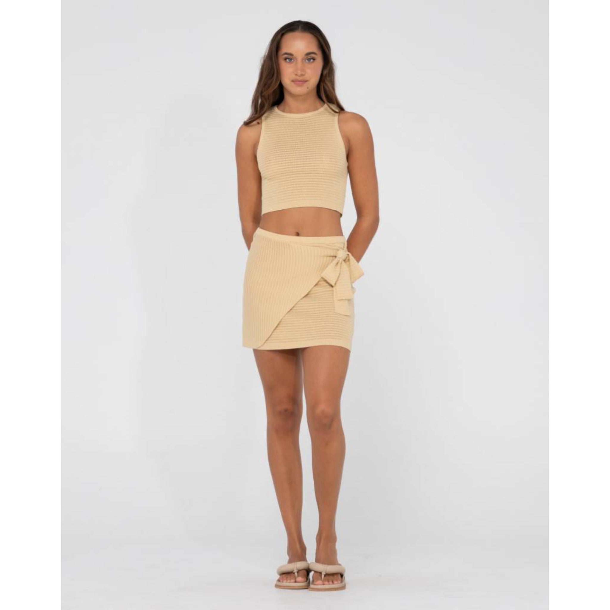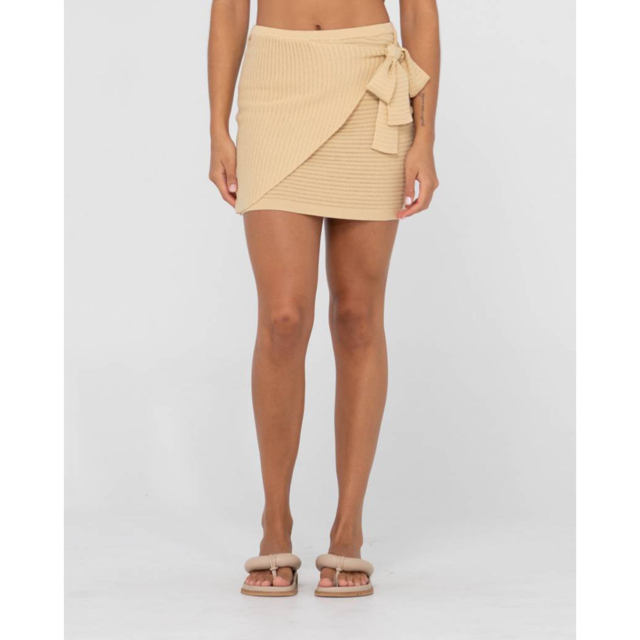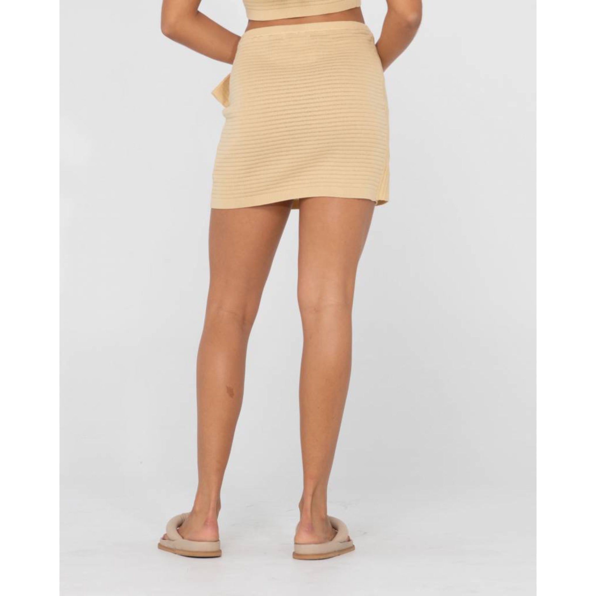 The new Summer Favourite, a slim fit knitted mini skirt with sarong tie detail with, made to look good on those hot summer days, and long balmy nights.