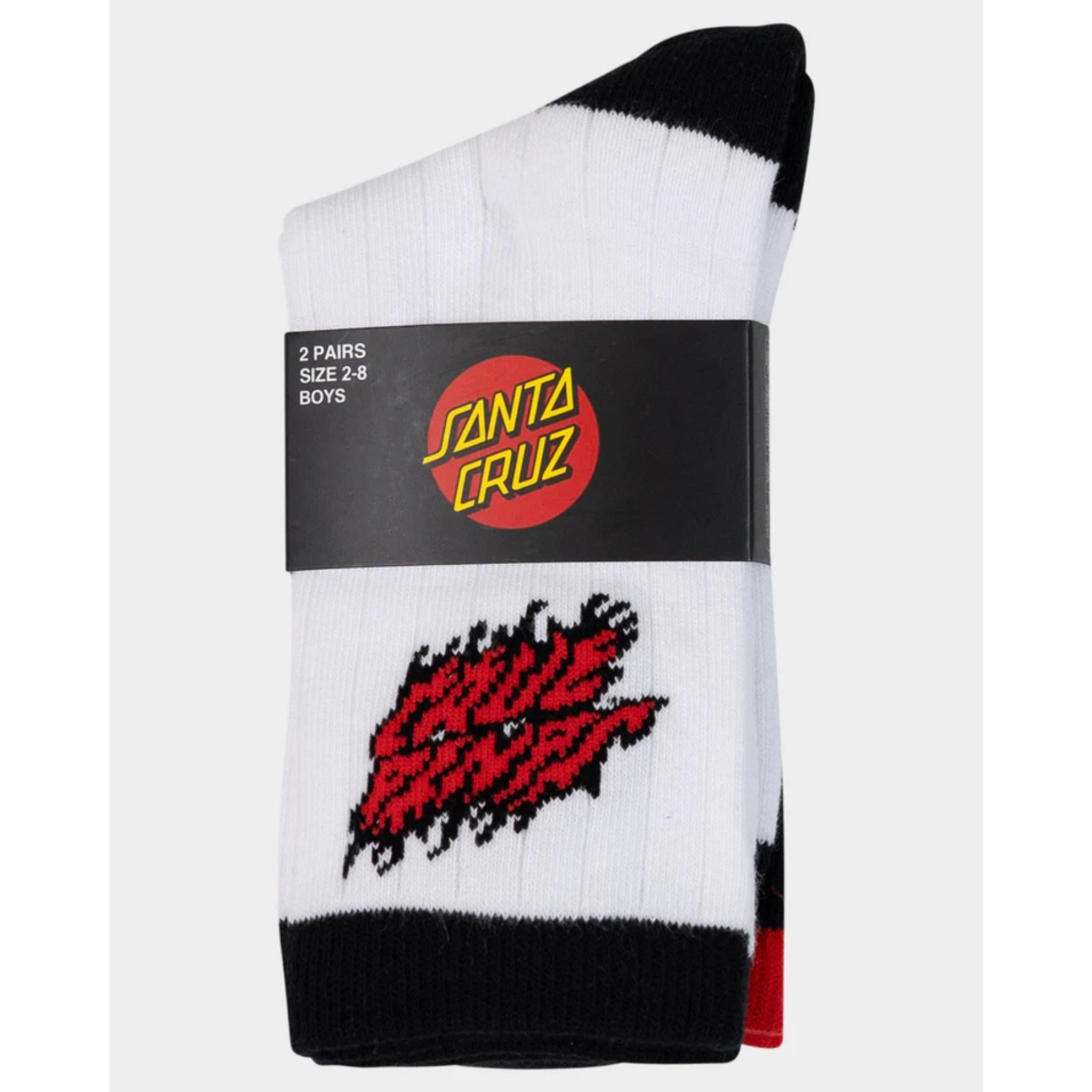 Boys Santa Cruz 2 pack crew socks featuring the Flamed Stack upside down artwork.