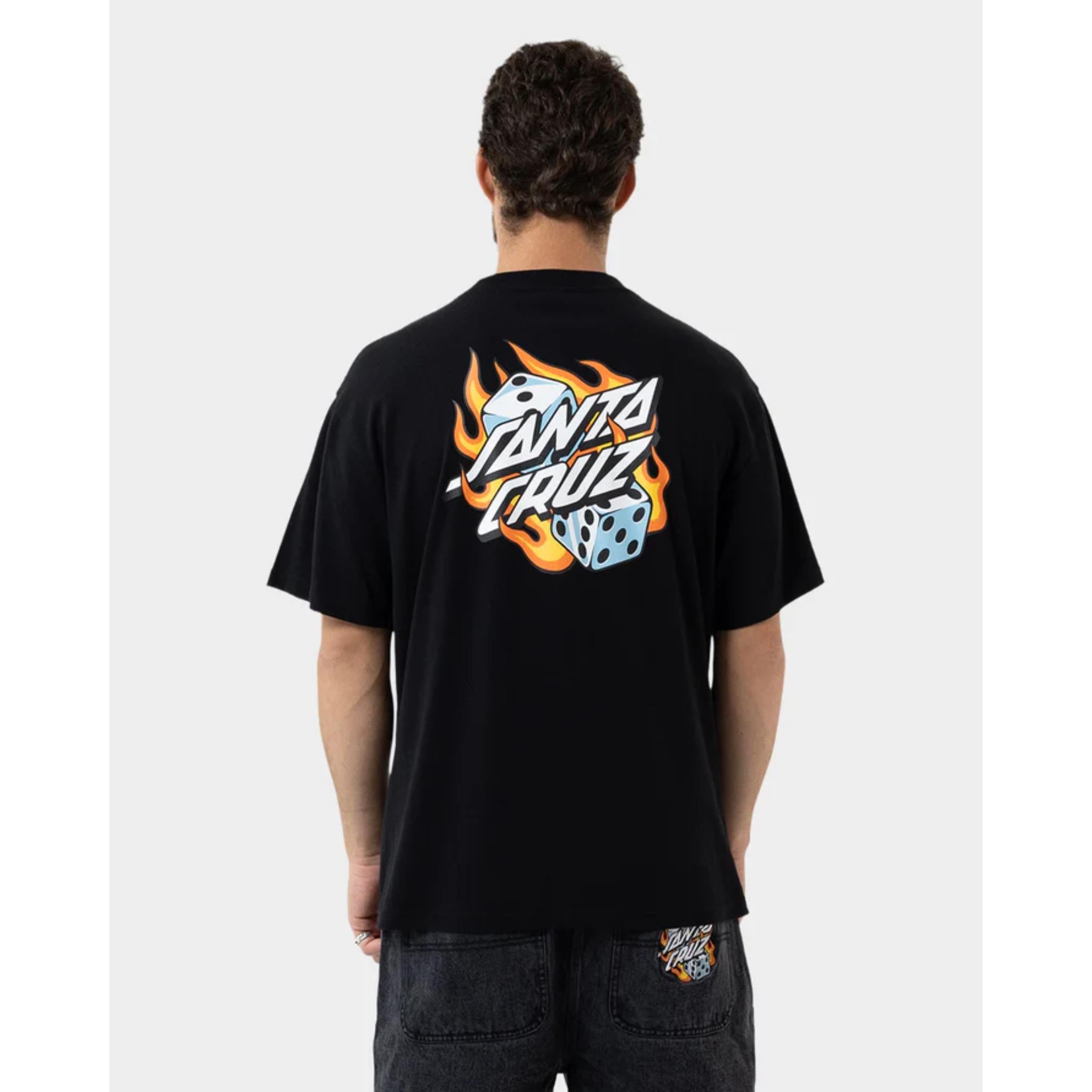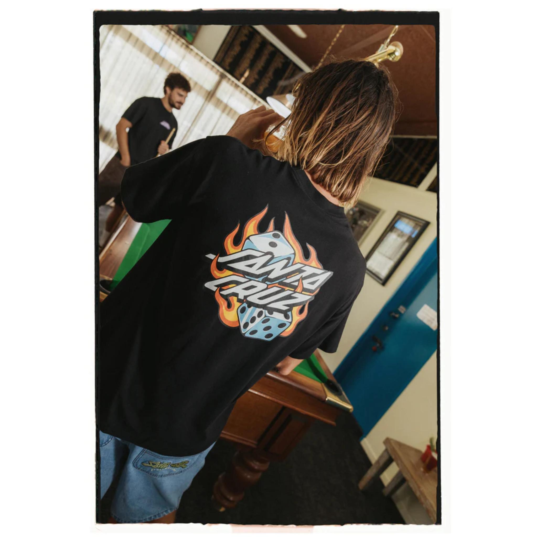 Men's Santa Cruz t-shirt featuring print of the Flaming Dice Dot Flash artwork.