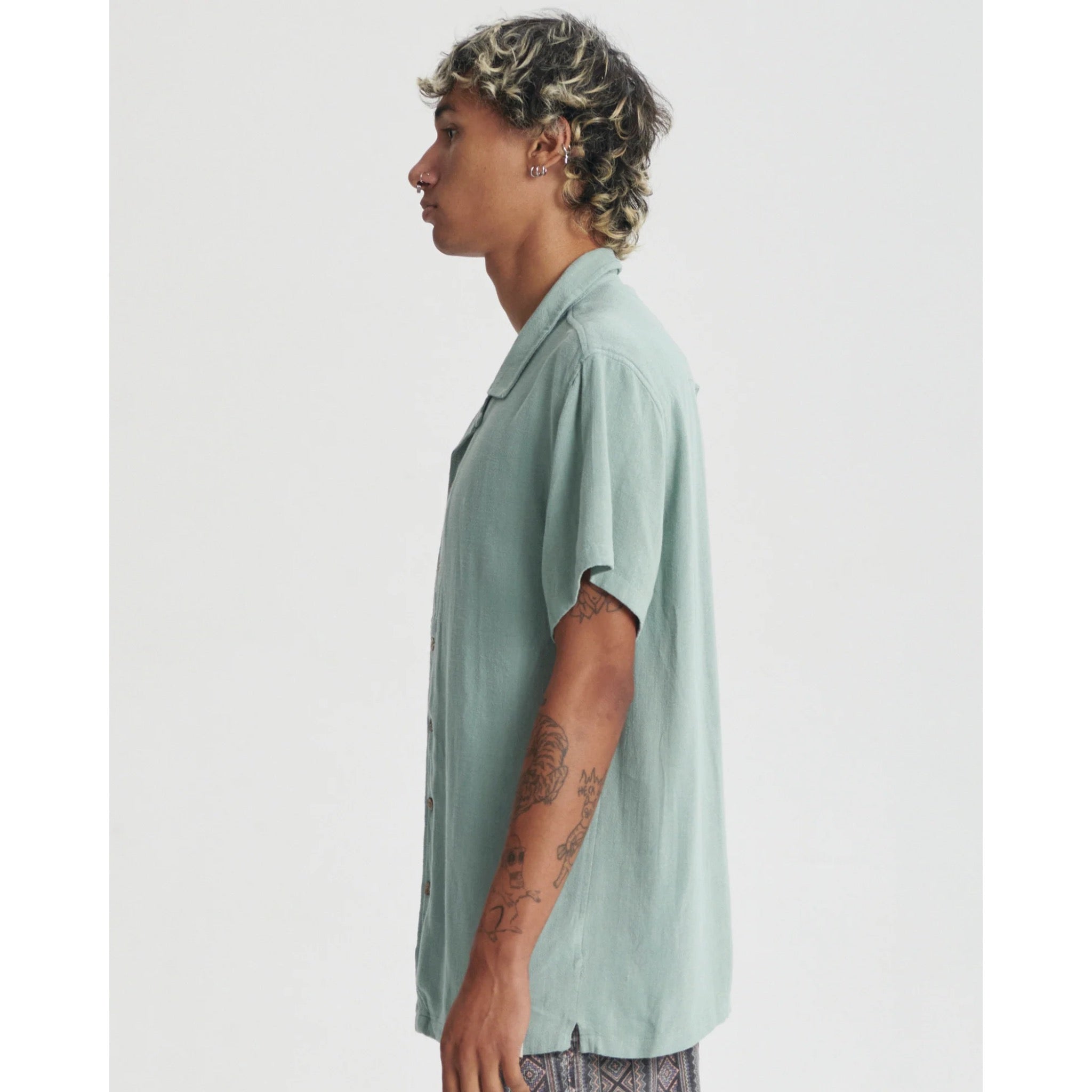 The Ernie Shirt is cut from a linen-blend summer-weight fabric with a resort-style open neck and an easy, relaxed fit that leans slightly oversized. A straight hem and side splits add comfort and movement, making it a silhouette we return to season after season. Take your regular size for that lived-in, oversized feel. Our model is 6'1" and wearing a size Large.