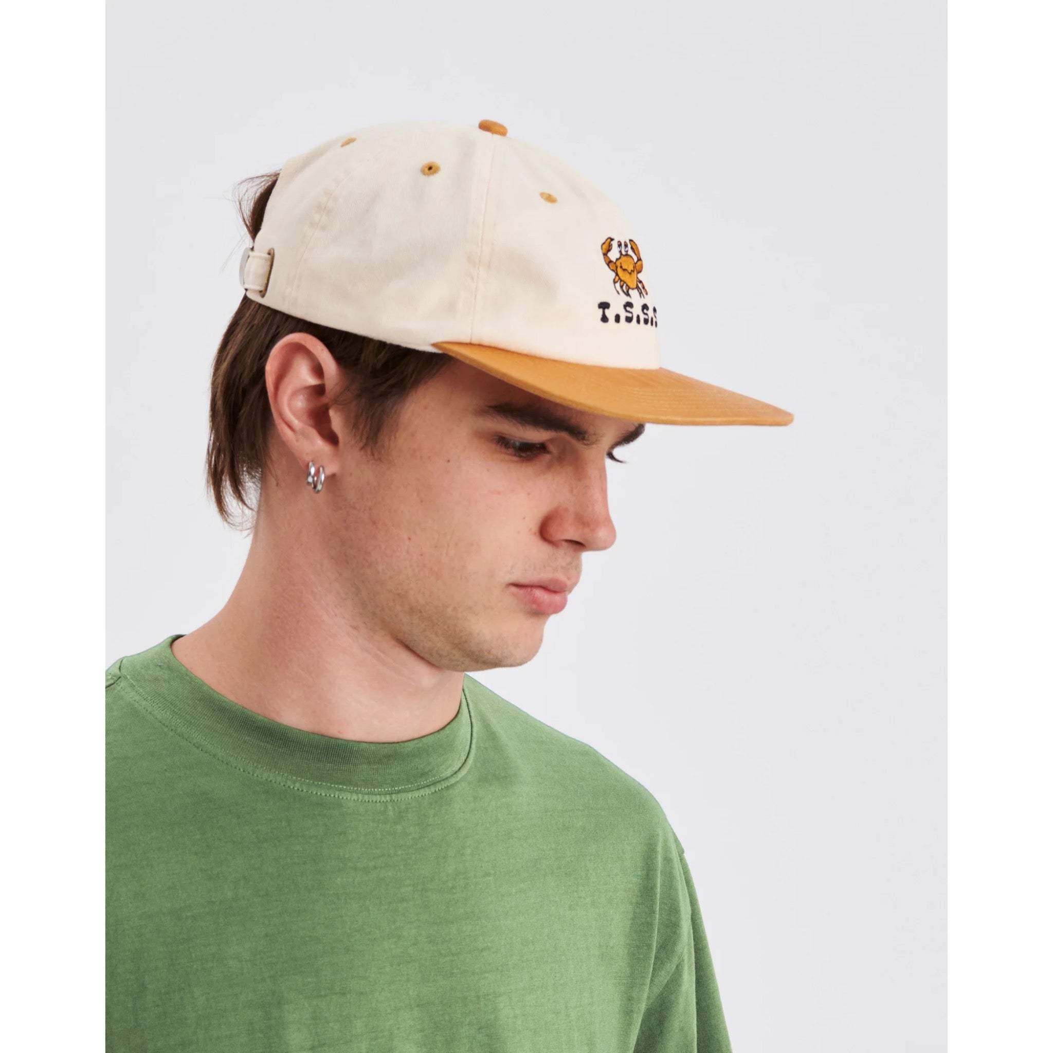 The Gerald Cap is a cotton twill snap back cap with crabs embroidery on the front. It's a Medium profile cap with a flat brim.
